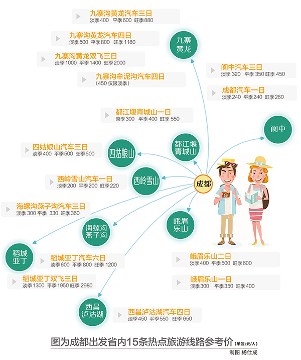 以从成都出发为例,记者罗列了一些热门线路指导价。