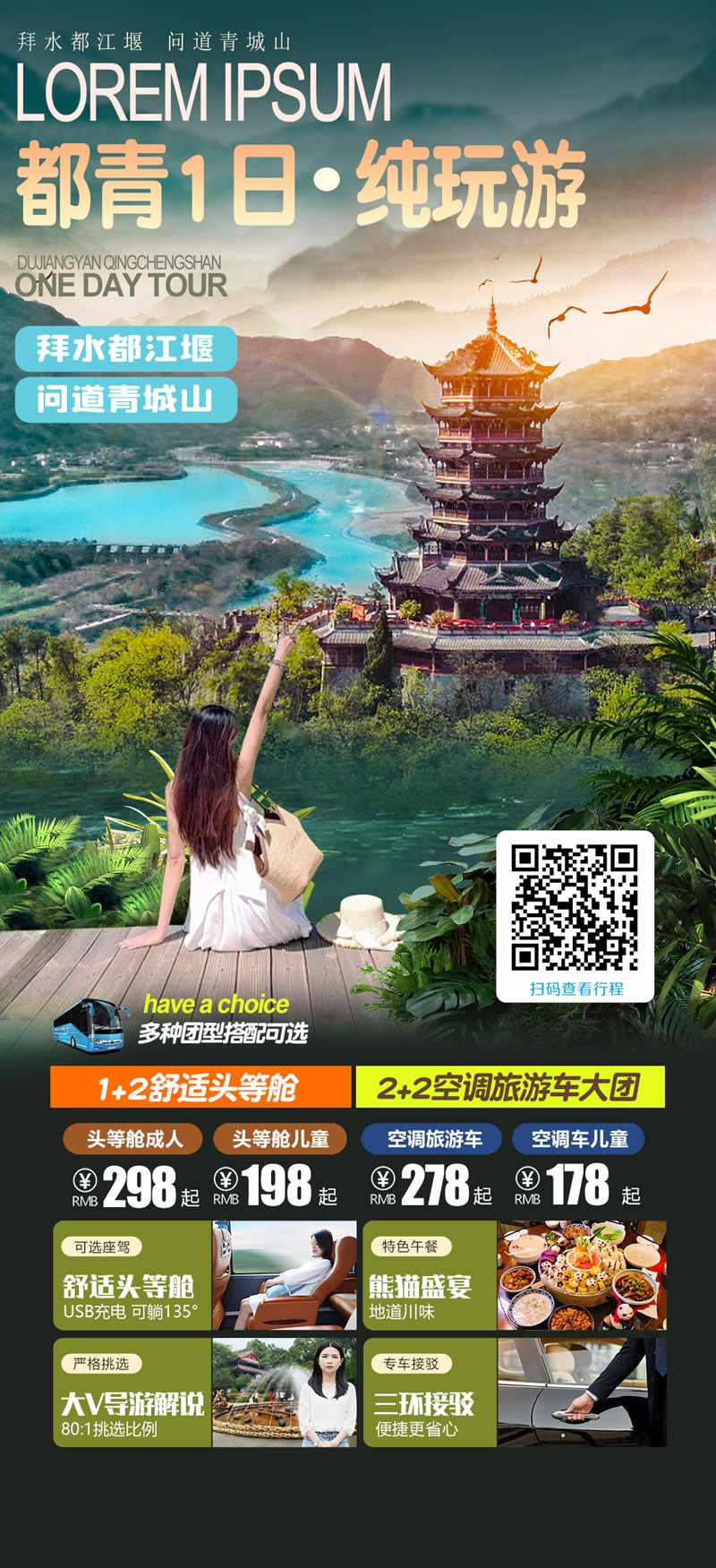 约13:00:前往中国道教发祥地----世界文化遗产--【青城山风景区】(游览时间2.5小时)青城山景区停车场至青城山景区电瓶车(自理20元/人),从山门进入,拾级而上,经雨亭、天然阁、怡乐窝、引胜亭,便来到了天然图画坊或乘坐游船经月城湖(费用自理,往返10元/人)和索道至上清宫(费用自理,往返60元/人),天然图画坊位于龙居山牌坊岗的山脊上,是一座十角重檐式的清代亭阁;经山荫亭、凝翠桥、五洞天来到道教创始人张道陵结茅传道居住地——天师洞,原路下山,感受青城空翠四合,峰峦、溪谷、宫观皆掩映于繁茂苍翠的林木之中。道观亭阁取材自然,不假雕饰,与山林岩泉融为一体的青城之“幽”看尽山间不同年代、不同风格的道教宫观,领略道家的文化魅力。