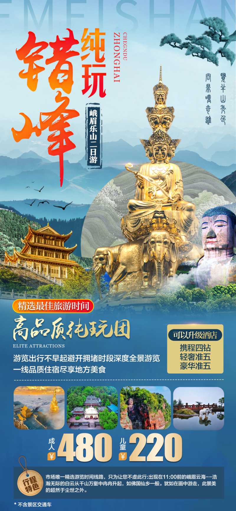 超值跟团游,花最低的价格享受更高的服务,轻松玩转乐山峨眉山寻缘 峨眉山,在金顶四方十面金佛祈求全家的平乐安康,有缘人还可在金顶感受立身成佛的神奇佛光兼享 乐山大佛、乐山睡佛两大景点,免除上山排队之苦,泛舟三江汇流品位 峨眉山山珍特色餐、峨眉院子火锅晚会、峨眉山九大碗,美味一直在你舌尖舞动贴心 设计错峰轻松游、全程一个优质导游是你的幸福顾问、打造独属于您一家人的幸福时光纯净 行程安排绝无自费困扰,合理的销售价格,只参观一个大佛禅院百年翠