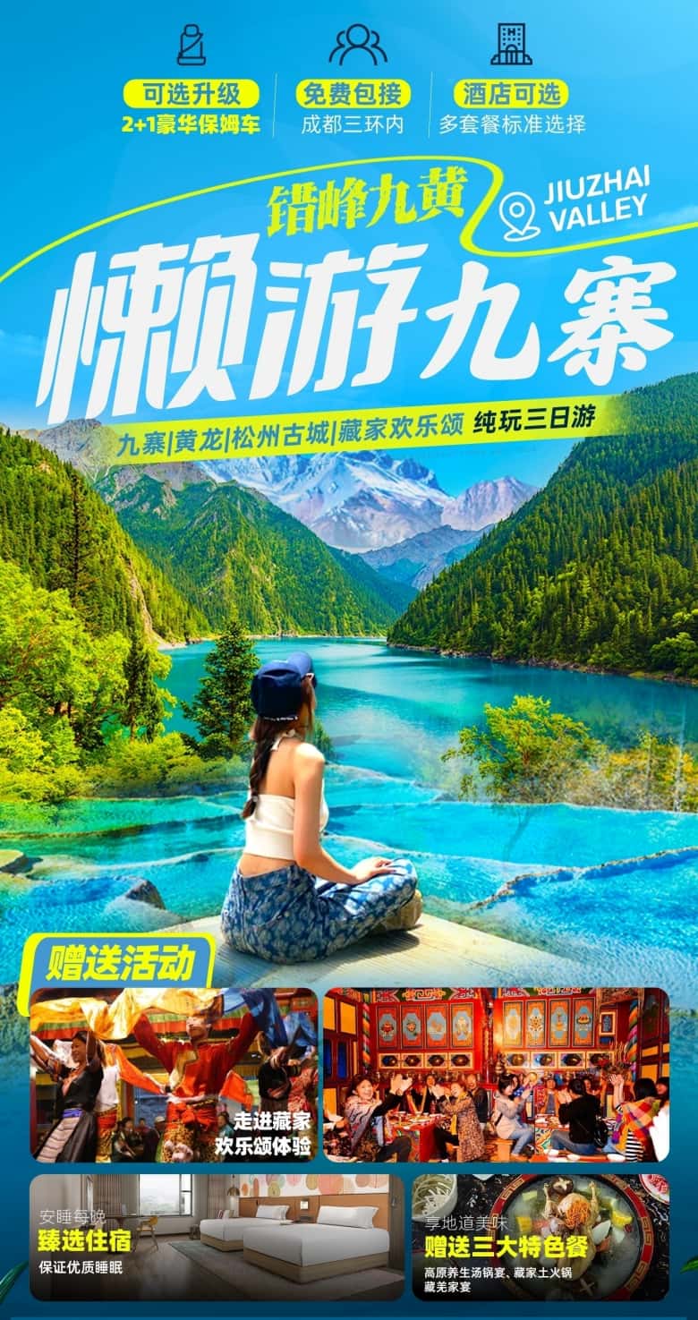 3.九寨沟属藏区条件较差,限电限水,限时供应热水,热水一般为晚9点至11点间供应,沿线提倡绿色环保,酒店不提供一次性洗漱用品,请游客自备。